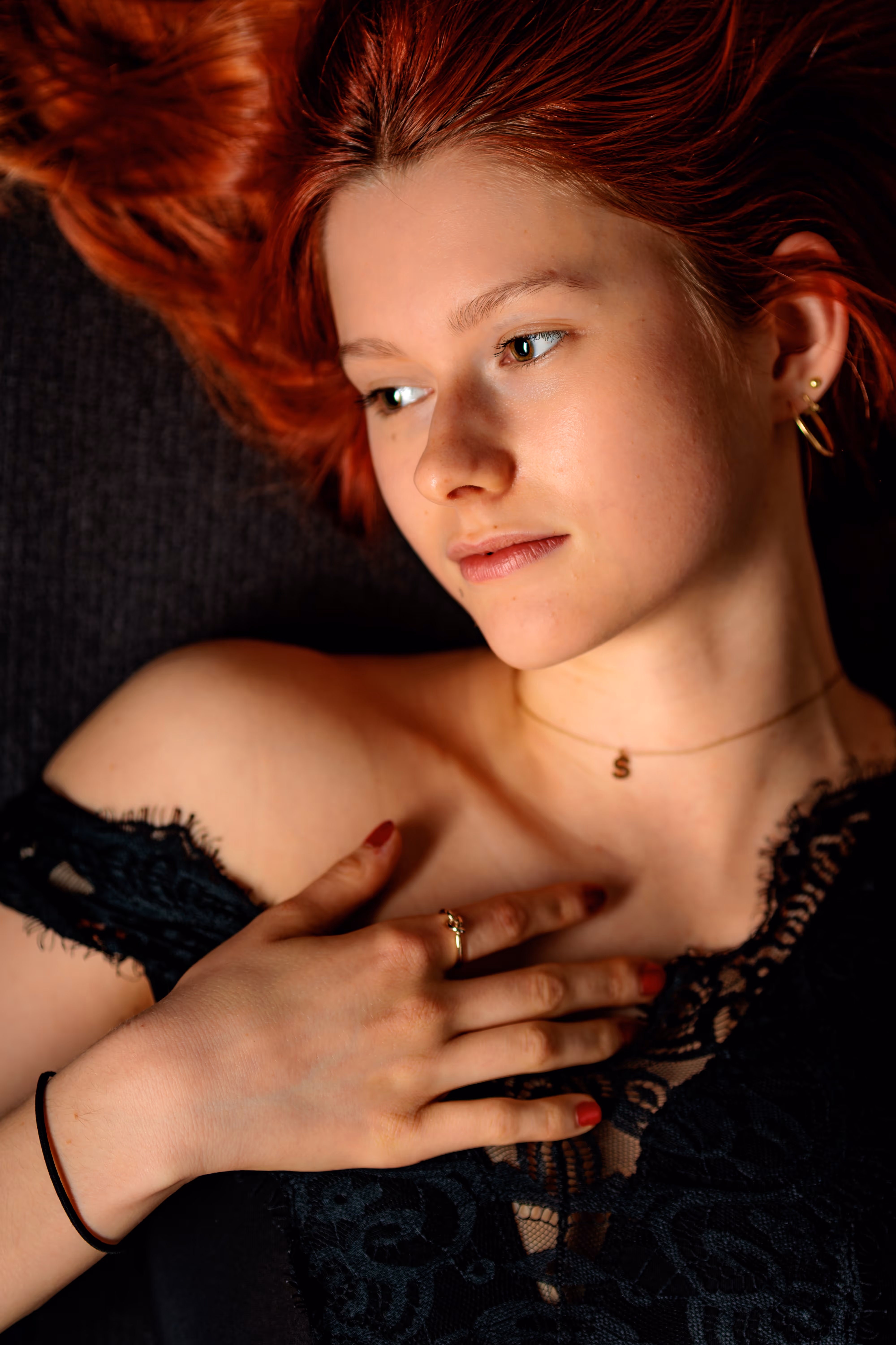 Sarahs markante rote Haare waren der absolute Ankerpunkt dieser Serie. Wir haben uns entschieden, mit dunklen Hintergründen und gezielter Lichtsetzung zu arbeiten, um diese Farben wirklich zum Leuchten zu bringen.