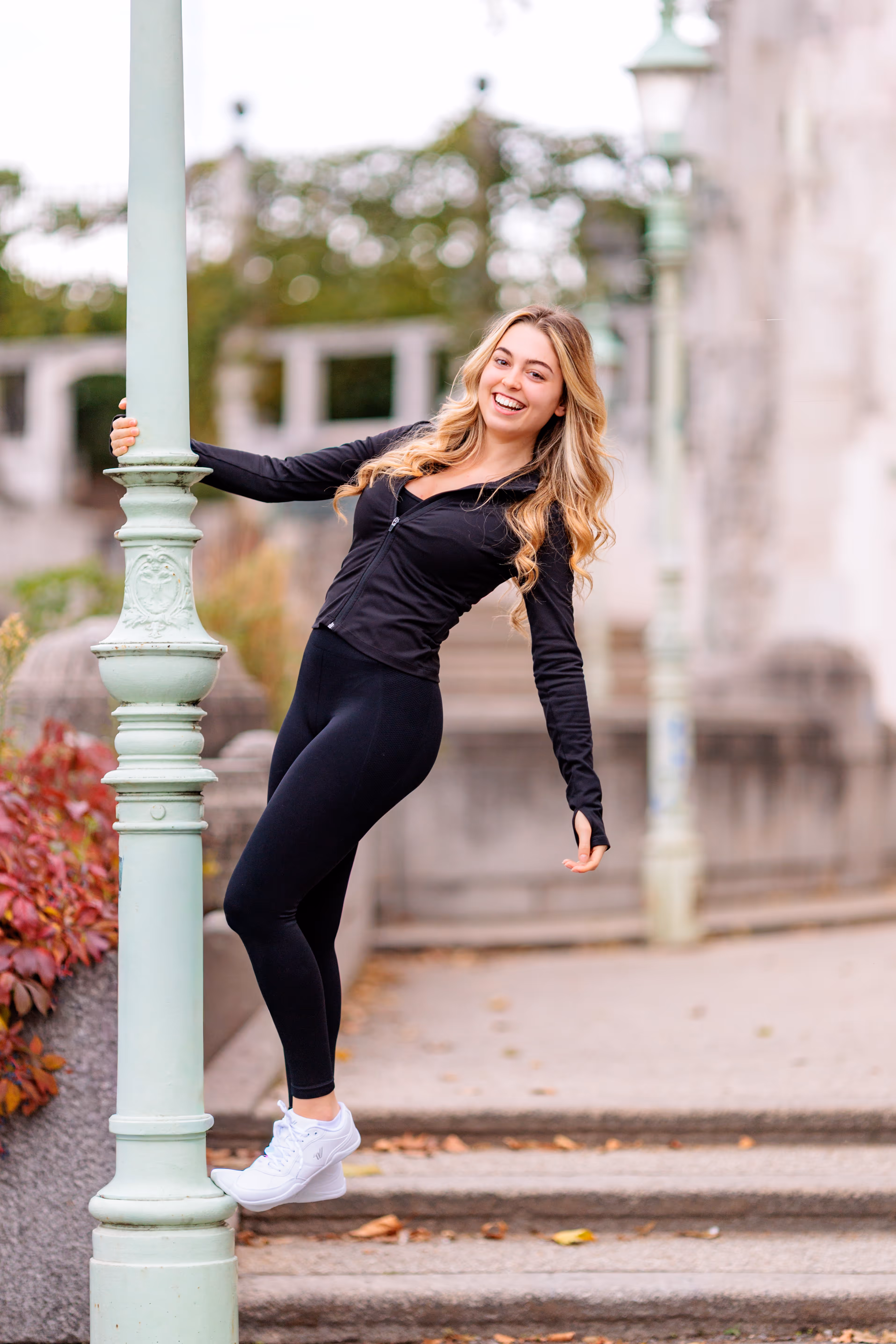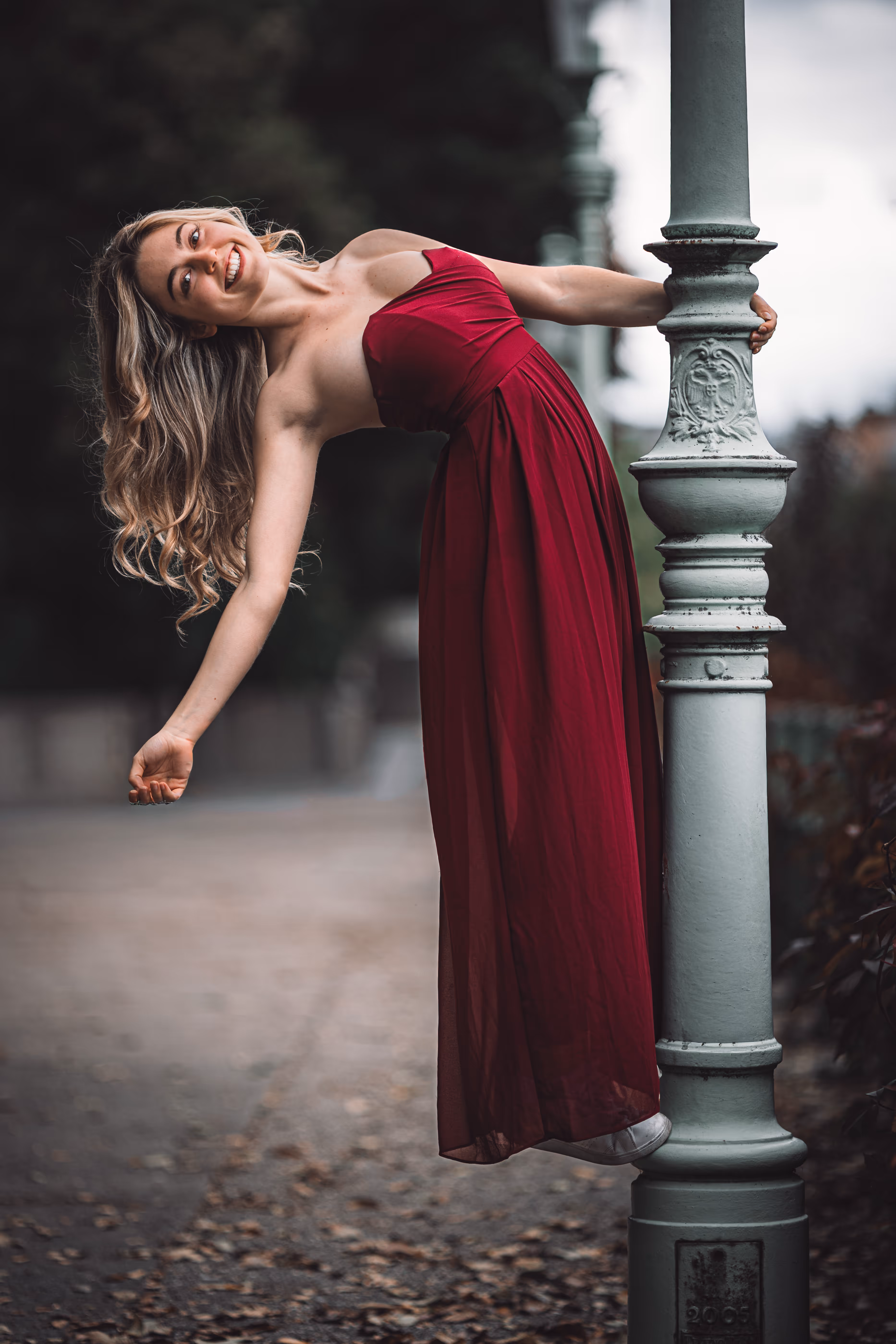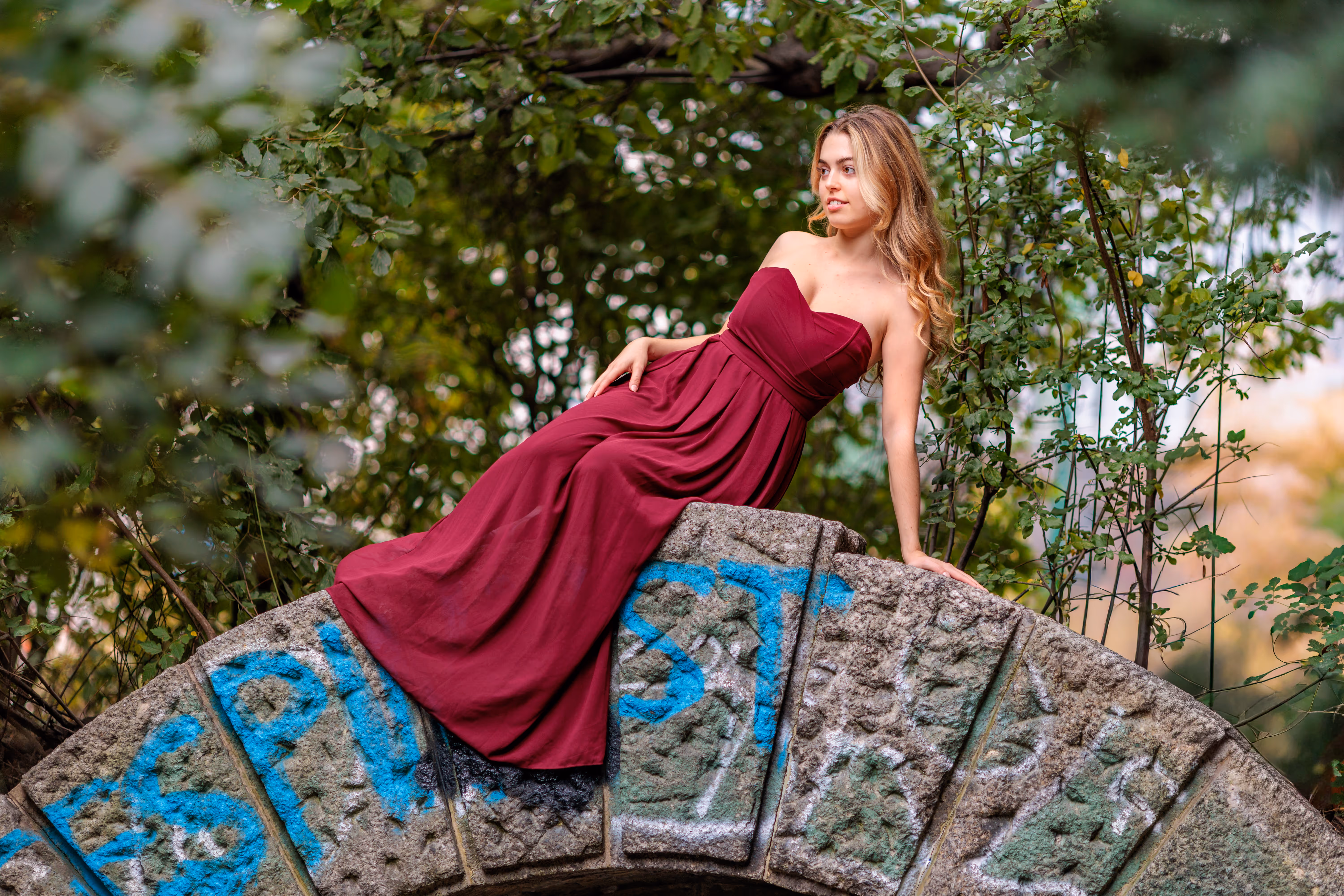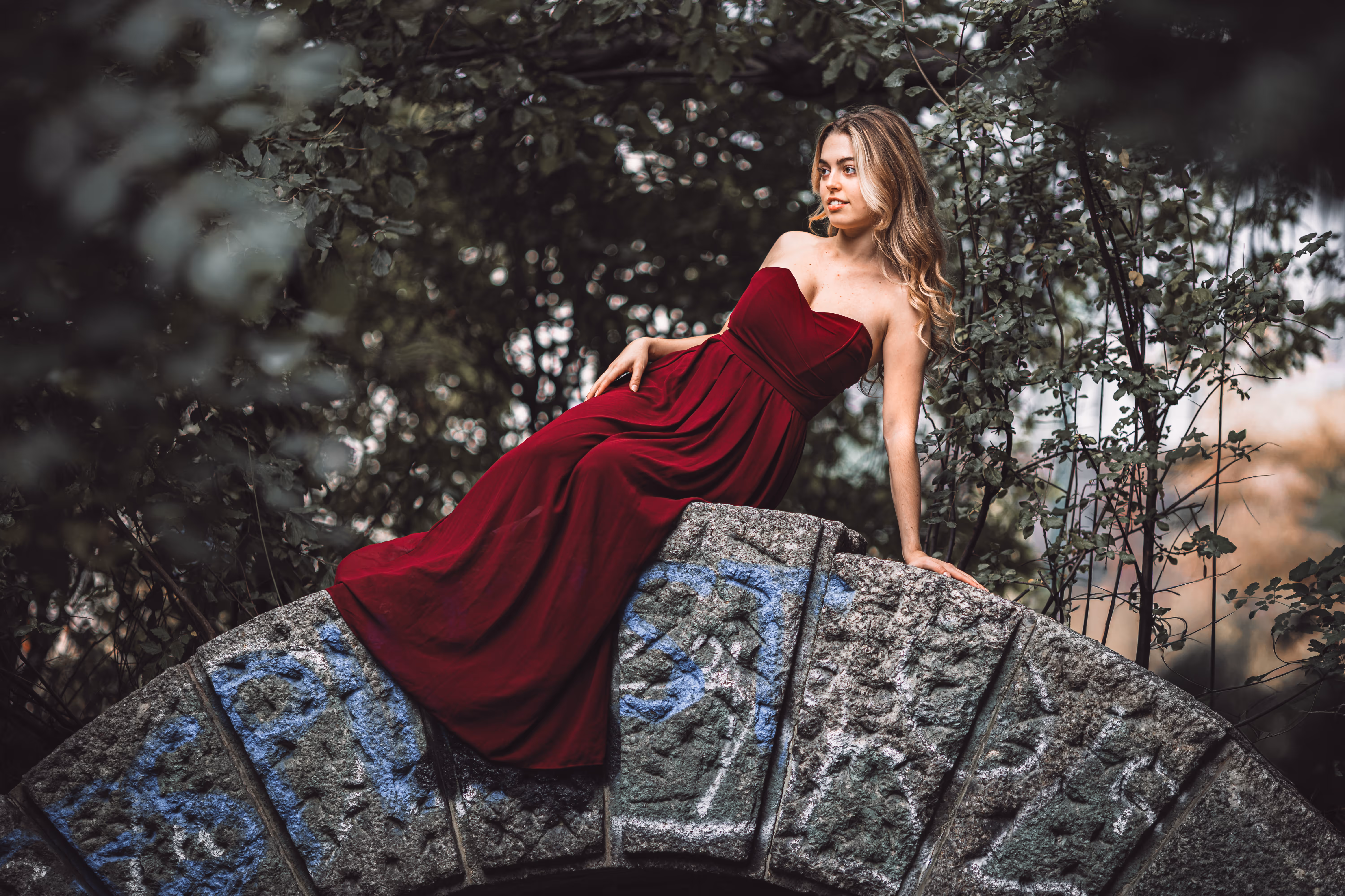 Für den zweiten Look wechselte Valentina in ein elegantes rotes Kleid, und wir nutzten die organische Kulisse alter Bäume und Säulen.