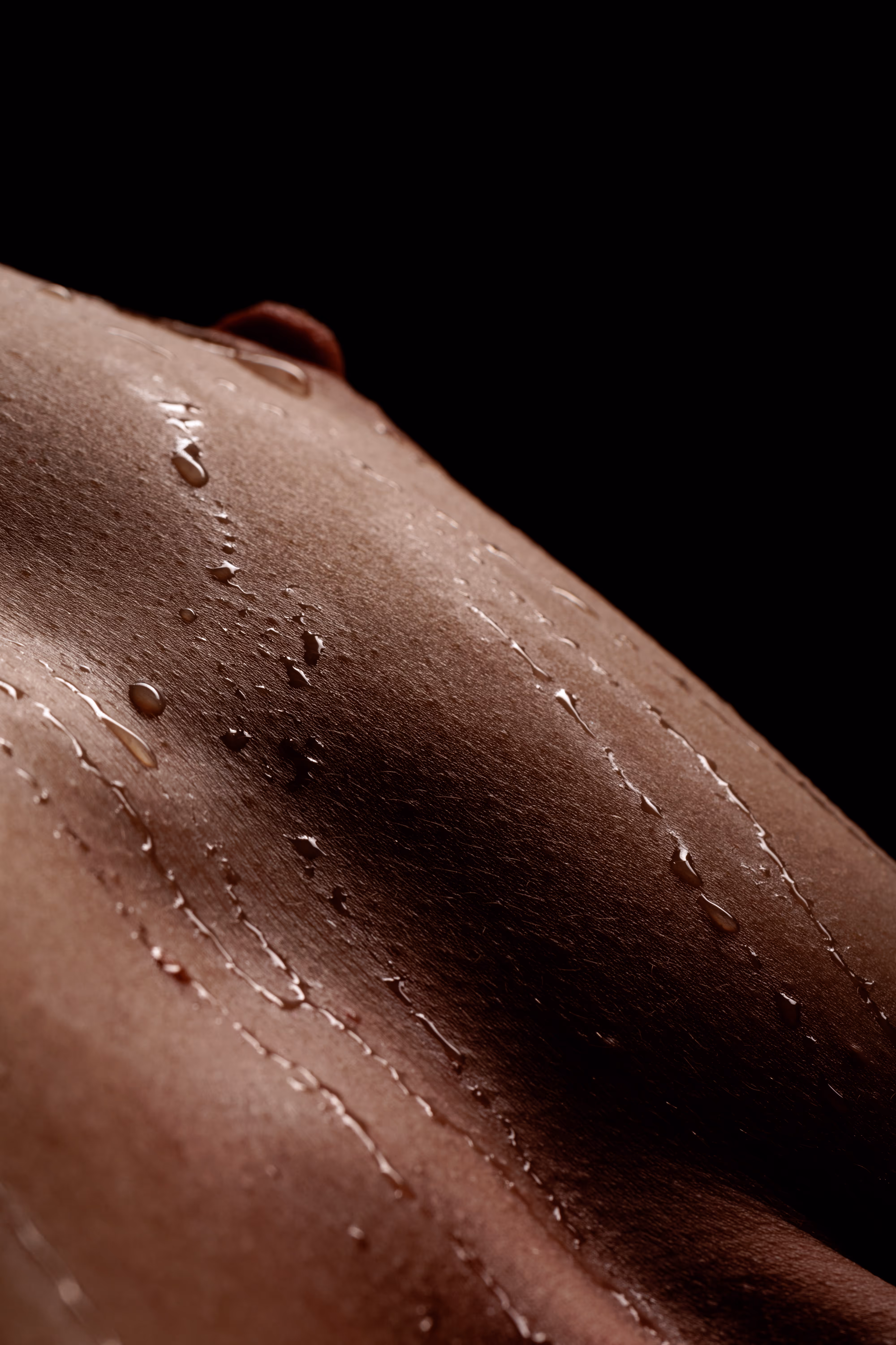 Hier arbeiten wir gezielt mit Wasser und hautpflegendem Babyöl direkt auf deinem Körper, um einen besonderen Glanz zu erzeugen und deine Formen zu betonen.