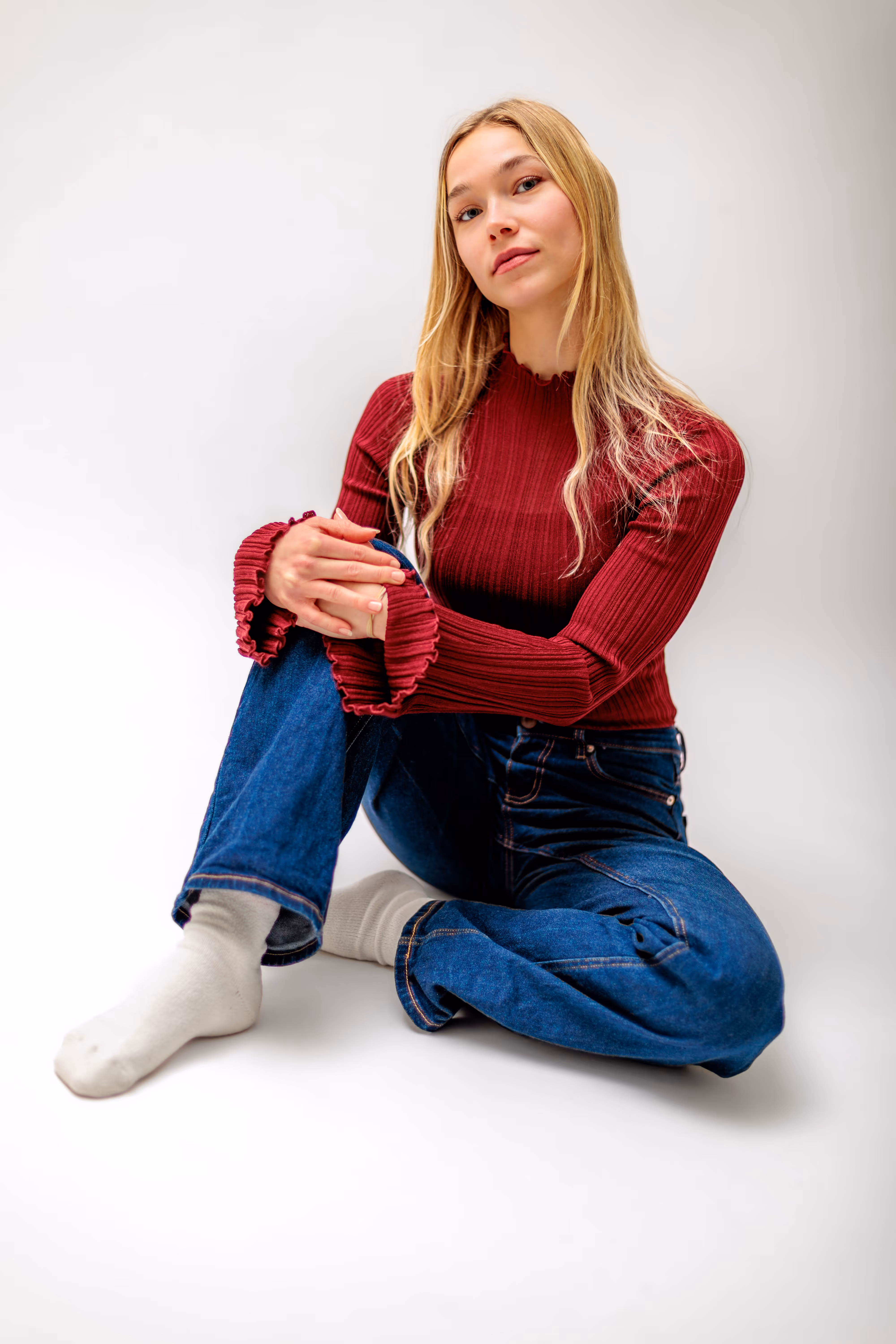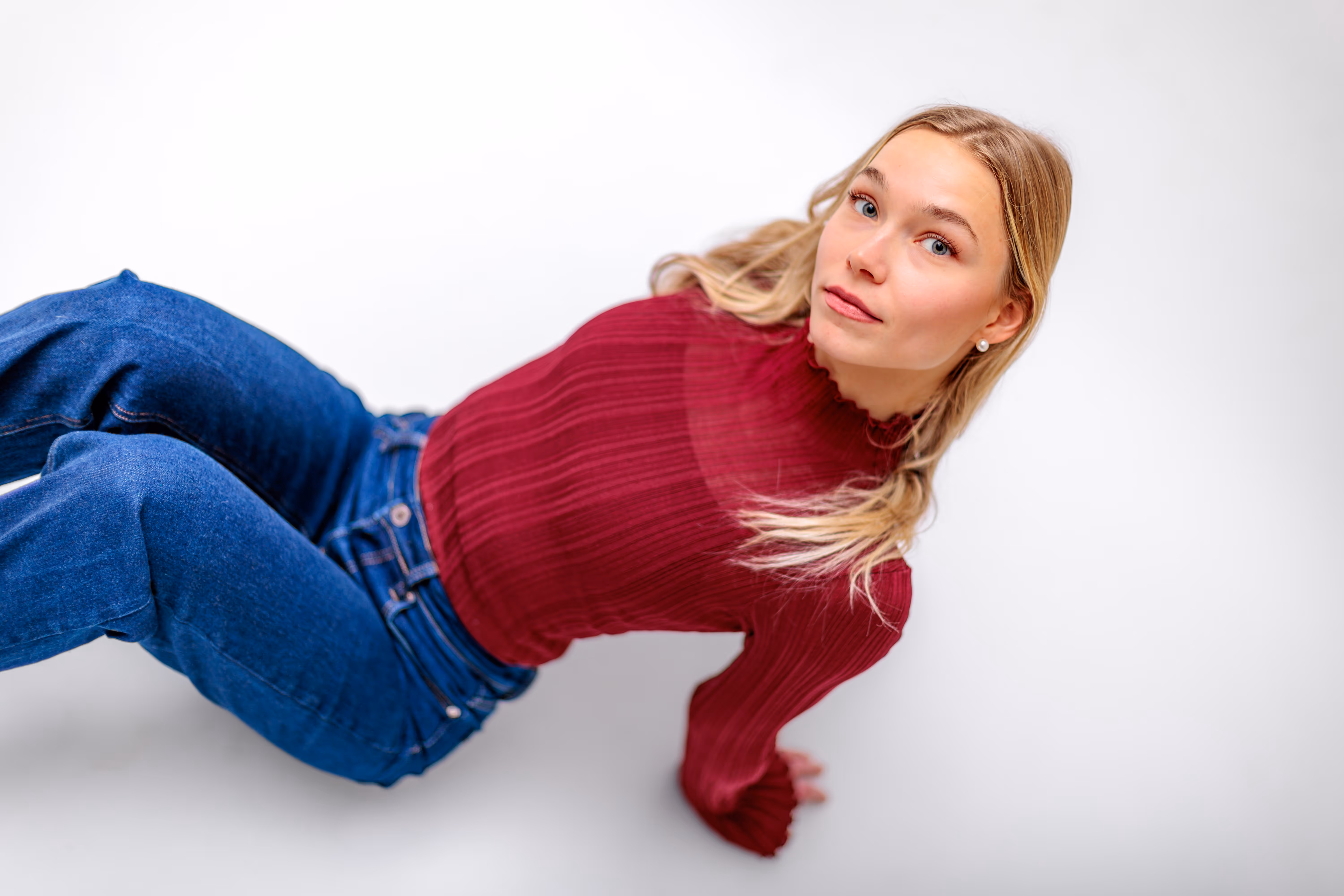 Wie Sie in unserer umfangreichen Bildergalerie sehen können, wurde bei diesem Teil des Shootings auch experimentiert. Von klassischen Headshots bis hin zu ausgefallenen Perspektiven – wie der Aufnahme am Boden, die mit Symmetrie und Beinen spielt – zeigt sich hier der Mut zur unkonventionellen Bildgestaltung.
