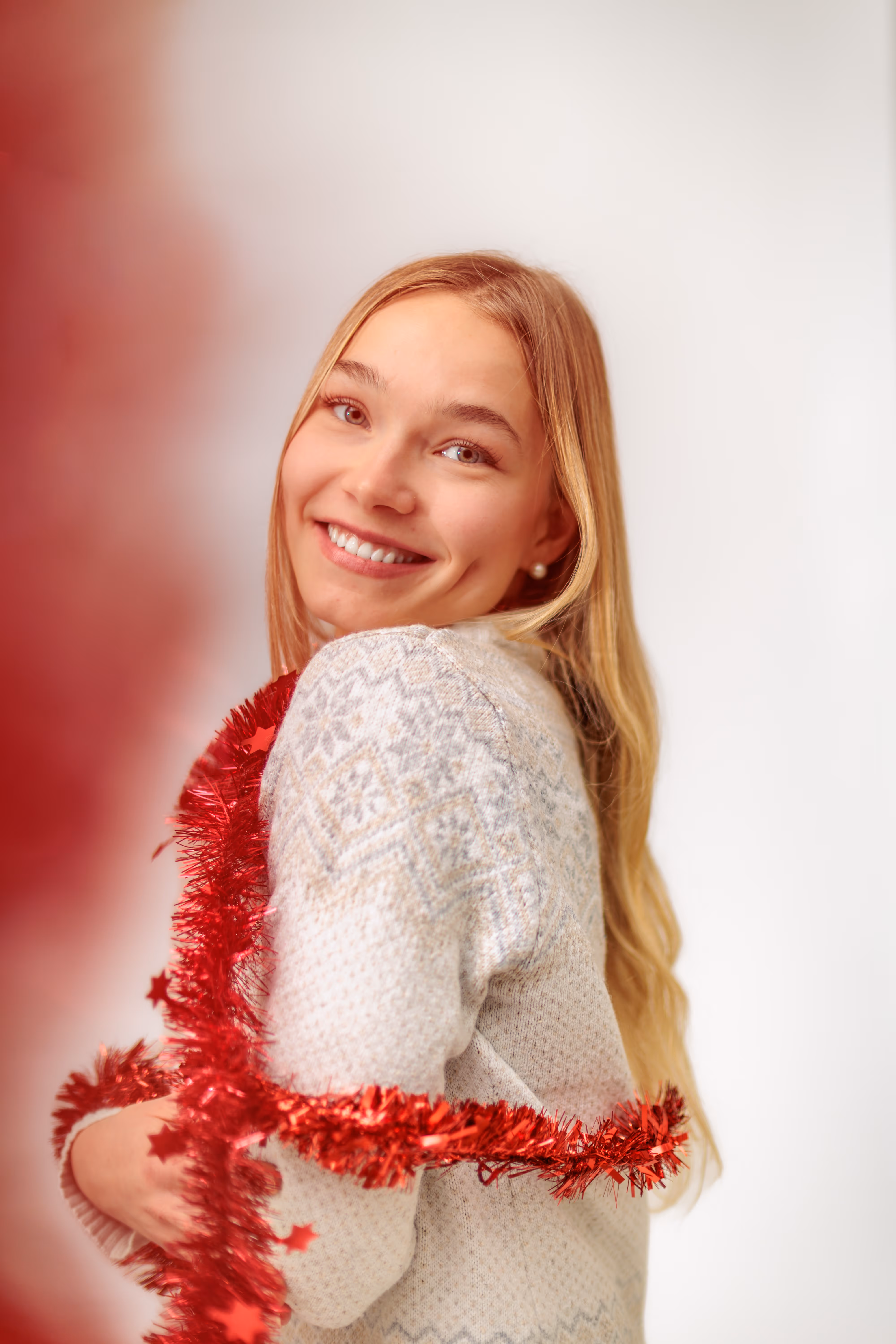 Den Auftakt der Serie bildet eine Hommage an die gemütliche Jahreszeit. Mit verspielten Requisiten und warmen Rottönen wurde eine Atmosphäre geschaffen, die sofort an Weihnachten denken lässt, ohne dabei kitschig zu wirken. Das strahlende Lächeln von Kathrin harmoniert perfekt mit dem funkelnden Tinsel, was den Aufnahmen eine natürliche Herzlichkeit verleiht.