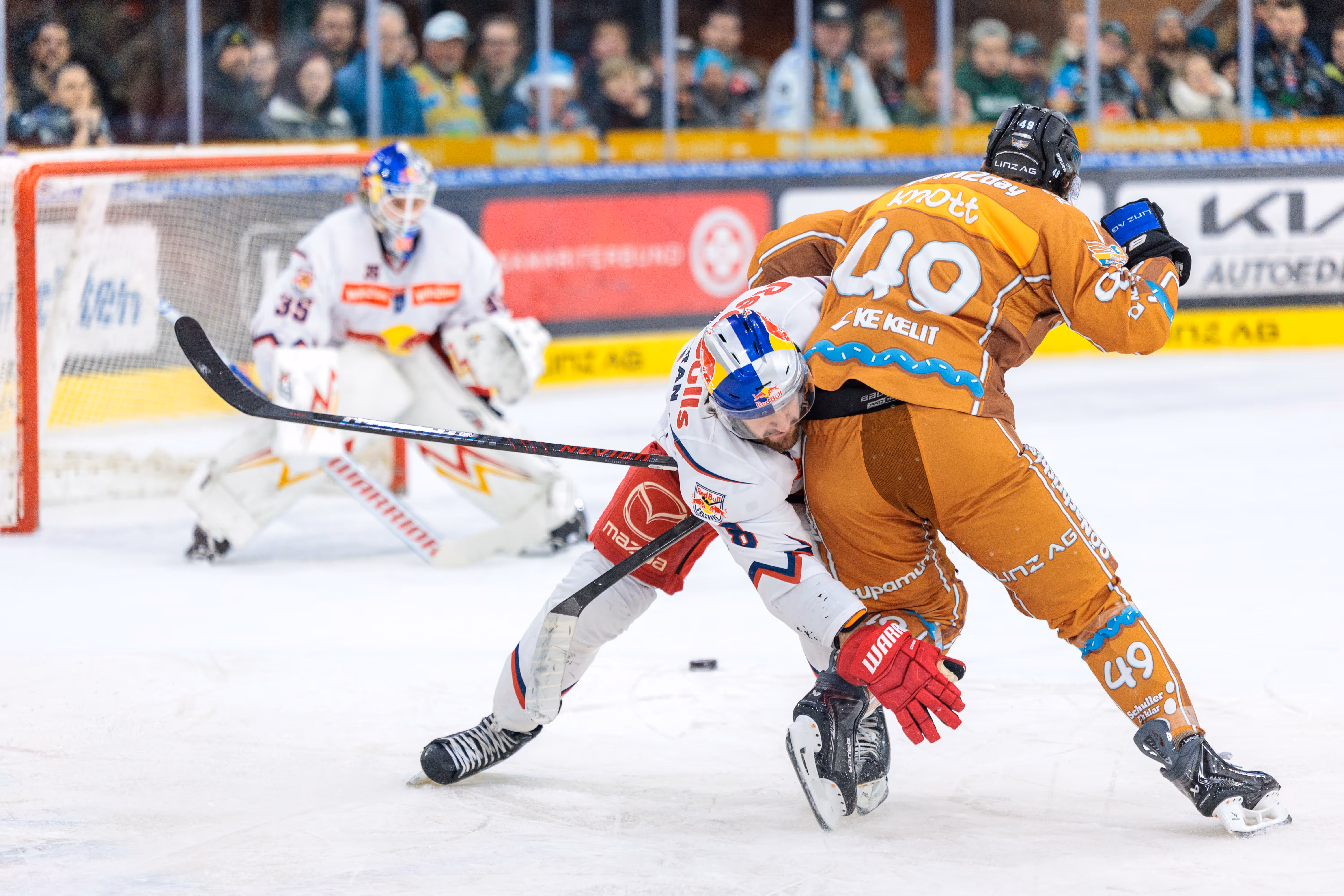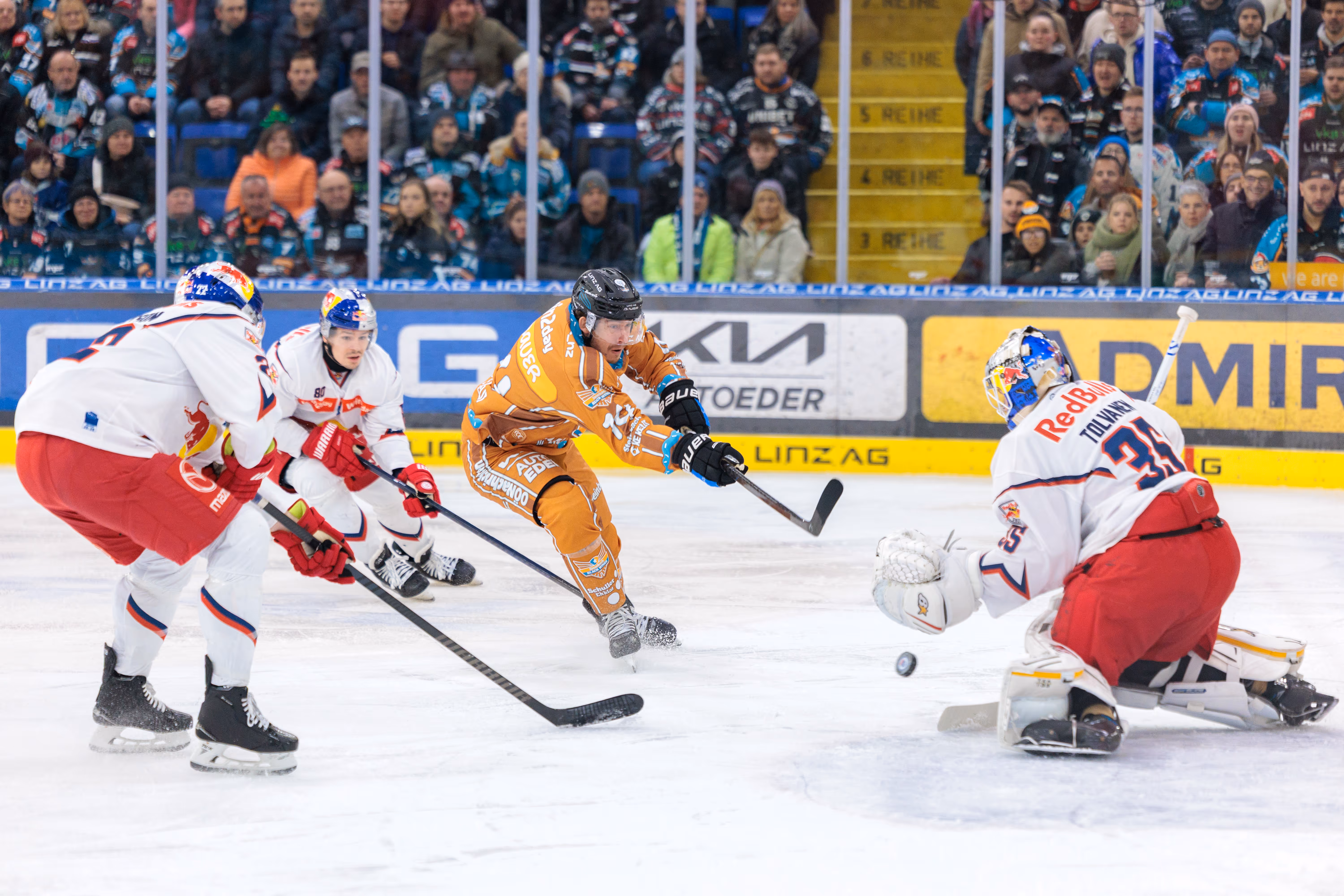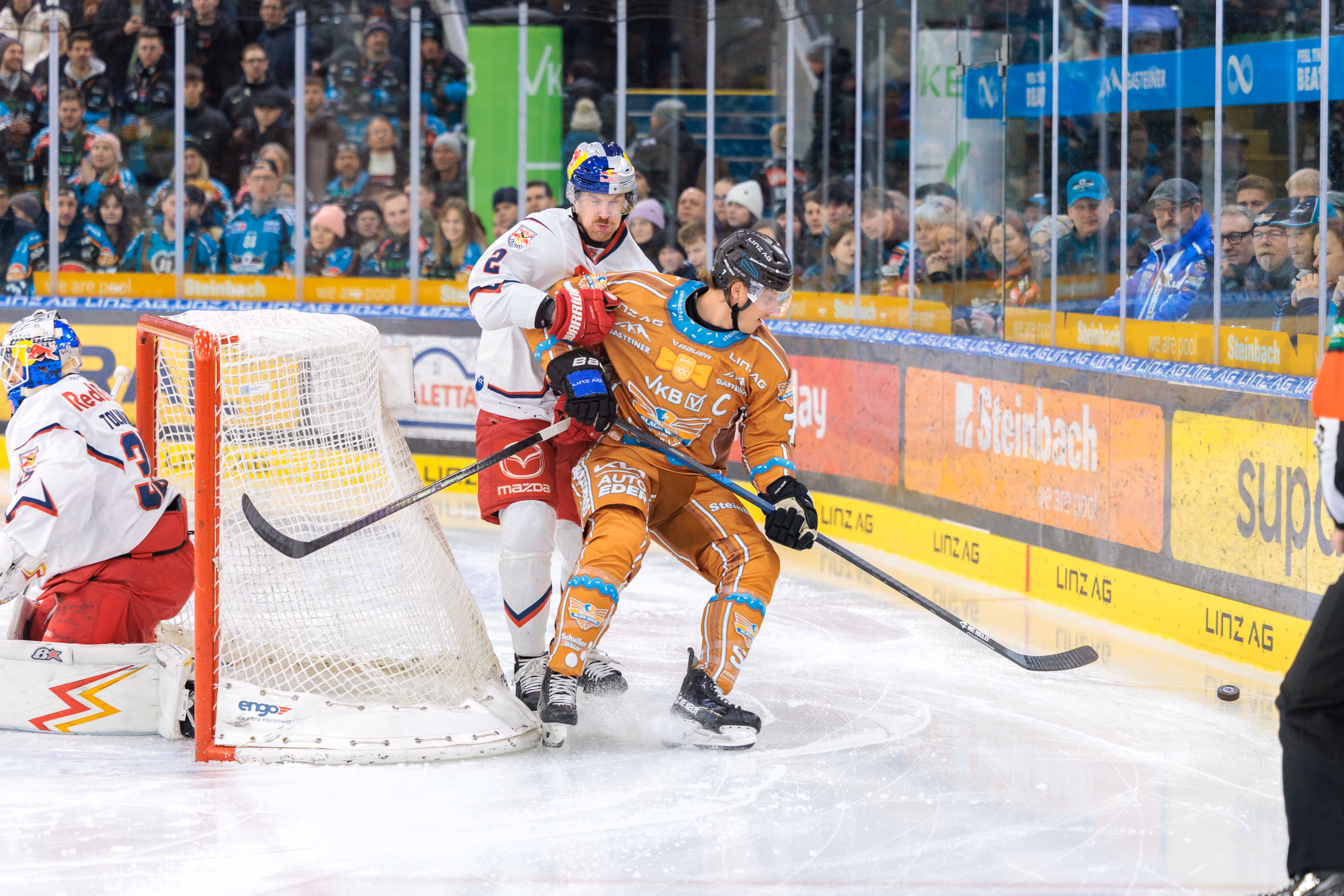 Die Linz AG Eisarena kochte, als Graham Knott den Puck zum 2:2-Ausgleich über die Linie drückte und die Fans hinter der Plexiglasscheibe in Ekstase versetzte. Es war der Höhepunkt einer Partie, die alles hielt, was ein Duell gegen den amtierenden Meister aus Salzburg versprach: Tempo, Härte und Emotionen pur bis zur letzten Sekunde.